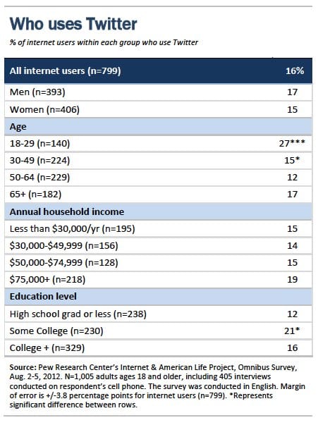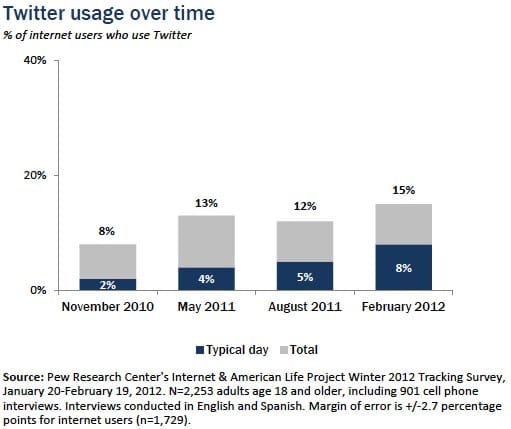 An earlier Pew study shows that daily Twitter users have doubled since last year, with over 8% of Americans using Twitter on a daily basis.