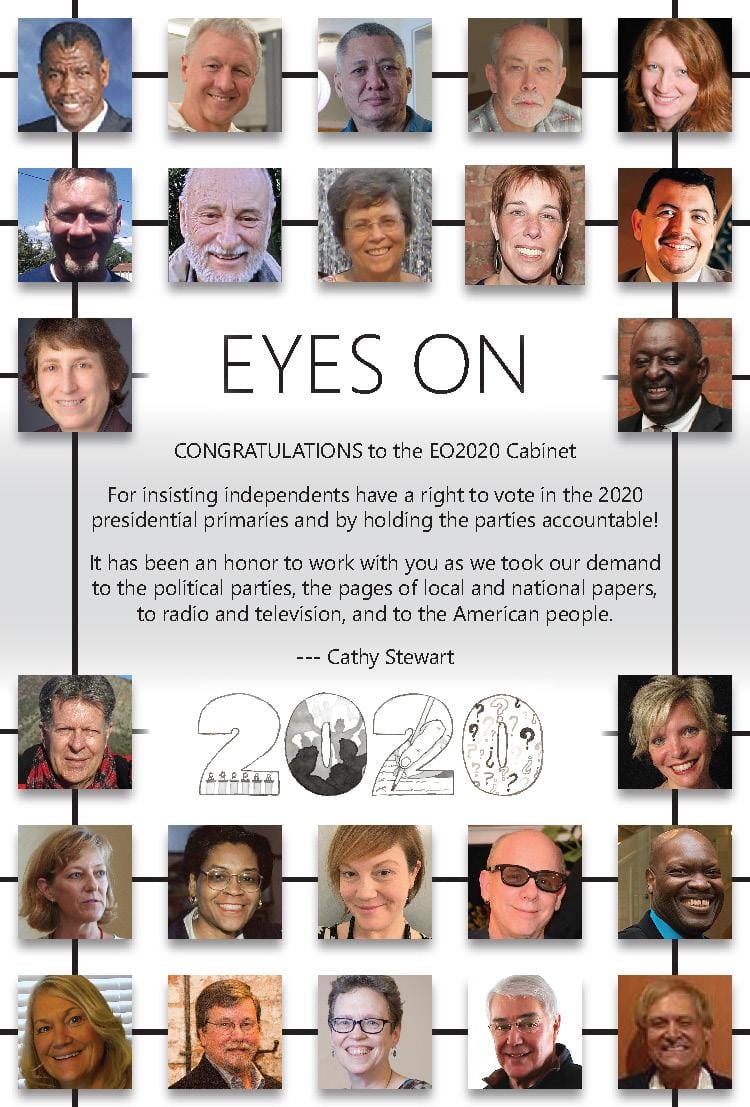 The Eyes on 2020 Cabinet was acknowledged next. Cathy Stewart introduced the group as having been formed to address one of the most significant and under acknowledged voter suppression issues in the country today—the exclusion of close to 26 million independents from casting a ballot in the presidential primaries. “It is a tough task, a critical task,” said Stewart “that is about inserting the voice of independents into every corner of our democracy, insisting that we be respected and recognized. The Eyes on 2020 Cabinet is a diverse group of leaders who rolled up their sleeves, designed campaigns, wrote letters, did press interviews, tracked down candidates and party leaders, gathered signatures and postcards, and did not stop when they heard “no.”