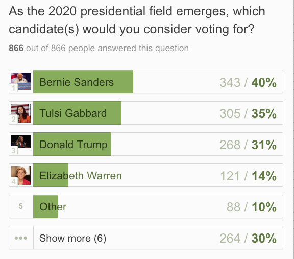 In full disclosure, this survey was not a scientific survey. It is not reflective of the 42% of the voting population that self-identifies as independent. However, it does show that many voters are still feeling the bern going into a new presidential election cycle.