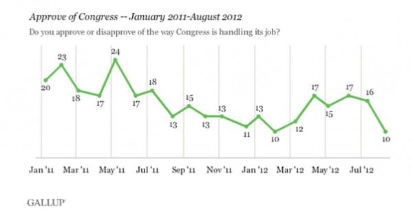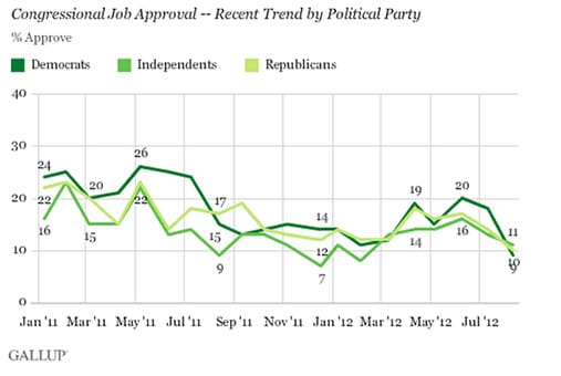 The disapproval of congress does not appear to be a partisan issue, as Republicans, Independents, and Democrats show an 11%, 10%, and 9% rating, respectively.