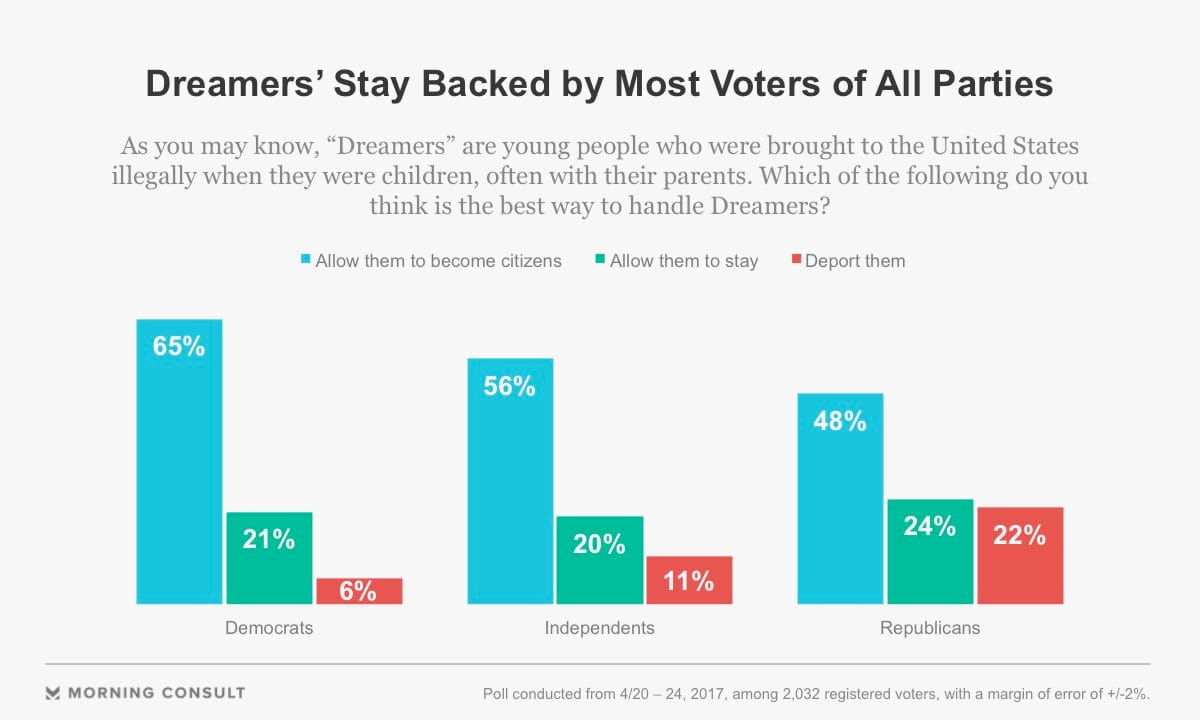 DACA (or the intention of the program, anyway) is not unpopular. A June Morning Consult and Politico poll found that 78% of respondents supported allowing DREAMers to become citizens. The poll even suggested that this included 73% of Trump voters.