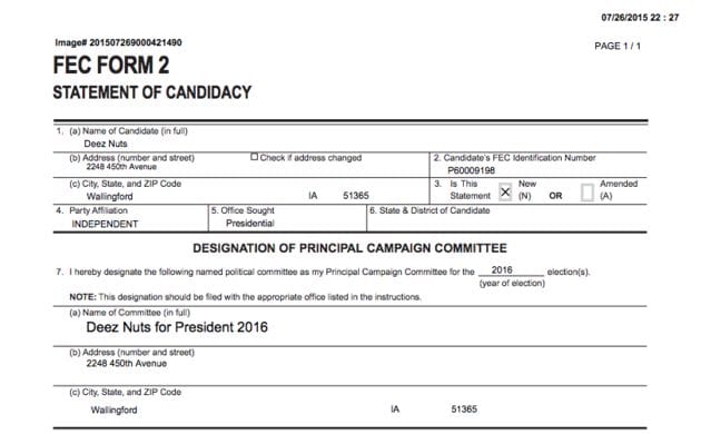 Among them is "Deez Nuts," who, according to the campaign's FEC form, lives in Iowa and is running as an independent. According to Public Policy Polling, Nuts is putting up decent numbers in North Carolina and Minnesota.
