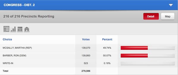 Democrat Ron Barber Widens Slight Lead Over Martha McSally
