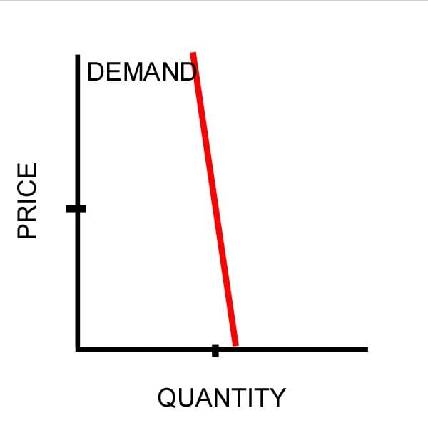 This is what the demand curve for kidney dialysis services looks more like. It's steeper than the generic demand curve in the first graph above. That's because even if you raise the price for kidney dialysis, people will buy nearly the same amount.