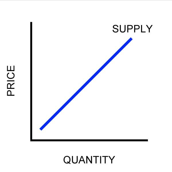 This is how the Law of Supply looks on the same graph. The Law of Supply states that the quantity of a good supplied by producers will tend to increase as its price increases and fall as its price decreases.