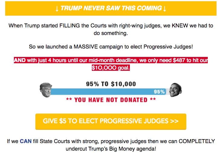 The email requests money for a campaign to elect Progressive Judges, an effort to combat President Trump's conservative judiciary push.