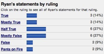 Politifact has also put together this profile on Paul Ryan, measuring his tendencies to stick to the facts. It reportedly tracks his statements as borderline true, with 27% of his statements "Half True" and 27% of his statements "Mostly False". These numbers are relatively low when compared to Joe Biden, whose statements are generally either "True", "Mostly True", or "Half True".