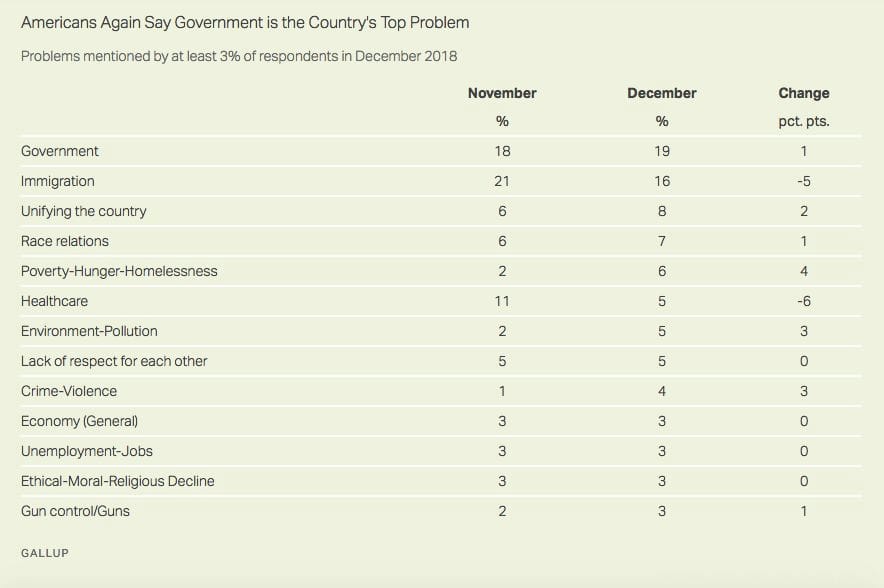In Gallup's first review since the midterm elections of public opinion regarding the most important problem facing America, government was the number one answer given by respondents, with 19% or 1 in 5 respondents saying some aspect of the federal government is the top problem facing the U.S. today: