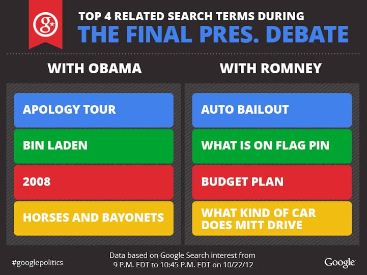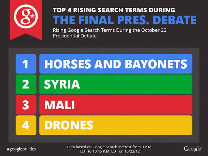 Aside from ‘Romney and Obama,’ the top four trending searches on Google during the debate were: horses and bayonets, Syria, Mali, and drones.