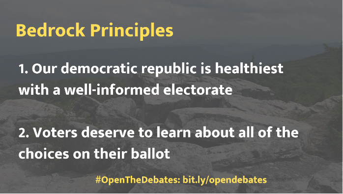 Starting with a handful of statewide elections in 2019, Open the Debates will shine a bright spotlight on this dark corner of our political system and will organize a non-partisan and cross-partisan force that will stand up for open political debates.