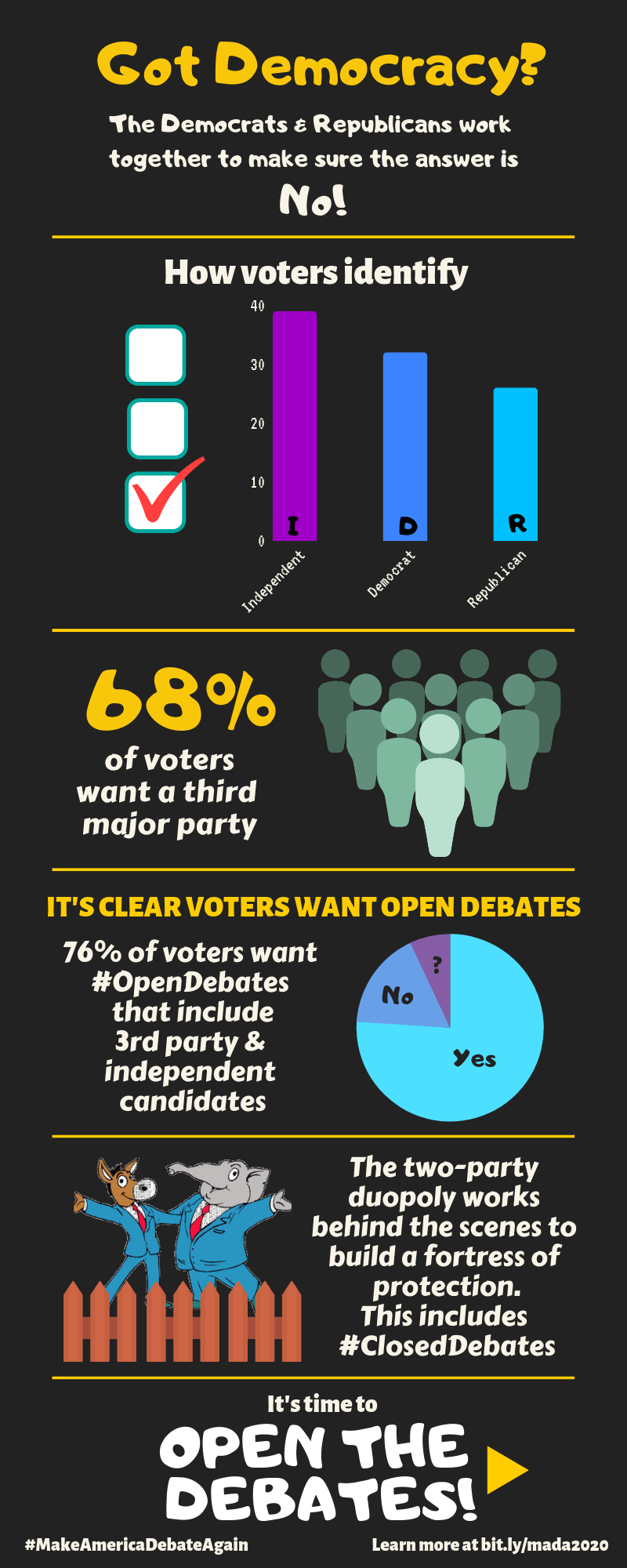 It’s time, America. It’s time to open up the political debates of our nation, at all levels. It’s time to Make America Debate Again. It’s time to take the fight to the weakest link in the duopoly’s chain of defense. It’s time to elevate the political discourse and open up the system to more voices and better choices.