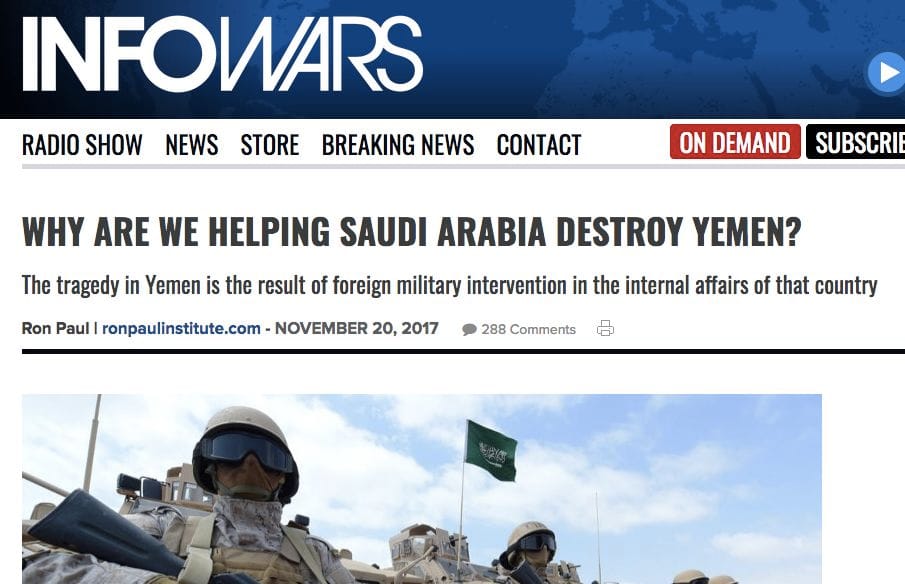 And in a twist of irony that elevates this context from surreal to a state of absurdity beyond all comprehension, while the mainstream media continues its blackout of this U.S.-backed violent humanitarian crisis in Yemen, which reached a fever pitch the same week Alex Jones was de-platformed for "glorifying violence" and "dehumanizing language" against Muslims, it turns out that Alex Jones' InfoWars has been one of the most outspoken and vocal critics of the intervention in Yemen(!).