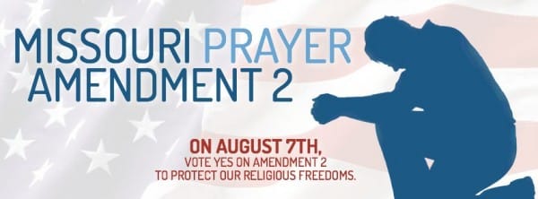 Missouri's Amendment 2, placed on yesterday's primary election, also known as the Public Prayer Amendment, passed with overwhelming support yesterday. With just 2% of the vote tallied, the measure was declared to be successful with over 87% of the vote at current count. The vote today comes as a blessing to those on the christian right that fear the secularization of America is threatening Christianity: