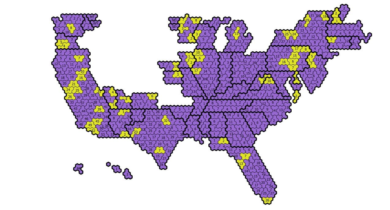 The 2018 report shows the most ossified electoral landscape yet, being the first year we have projected more than 370 seats at this degree of confidence. The following map shows each congressional seat as an equal area. Only the yellow seats are in play; the purple seats are all safe enough to be projected with high confidence.