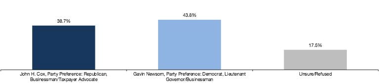 Newsom now leads Republican businessman John Cox by only 5 points, 44 to 39 percent, with still 17 percent of the poll's participants undecided.