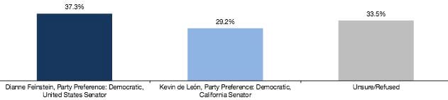Feinstein's lead over Kevin de León has been trimmed to 8 points, leading 37 to 29 percent. However, 34 percent of respondents remain undecided in that race.