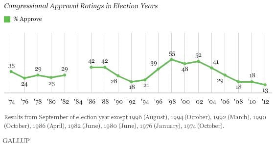 These five incumbents include two representatives that have been in Congress since the Nixon Administration in the 1970s, and all five have been in Washington since the 1990s and have held office for over a decade, the same decade during which Congress' approval rating has steadily slipped from a near all-time high during an election year in 2002 to an all-time low during an election year of just 13% as of mid-September this year.