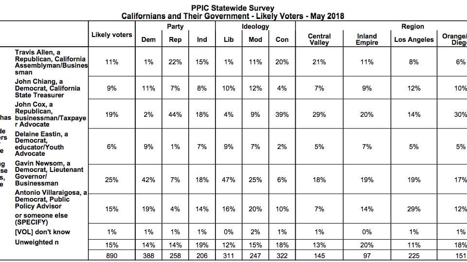 Both leaders, John Cox and Gavin Newsom, saw huge drops in NPP support from April to May by 5 and 7 points respectively.