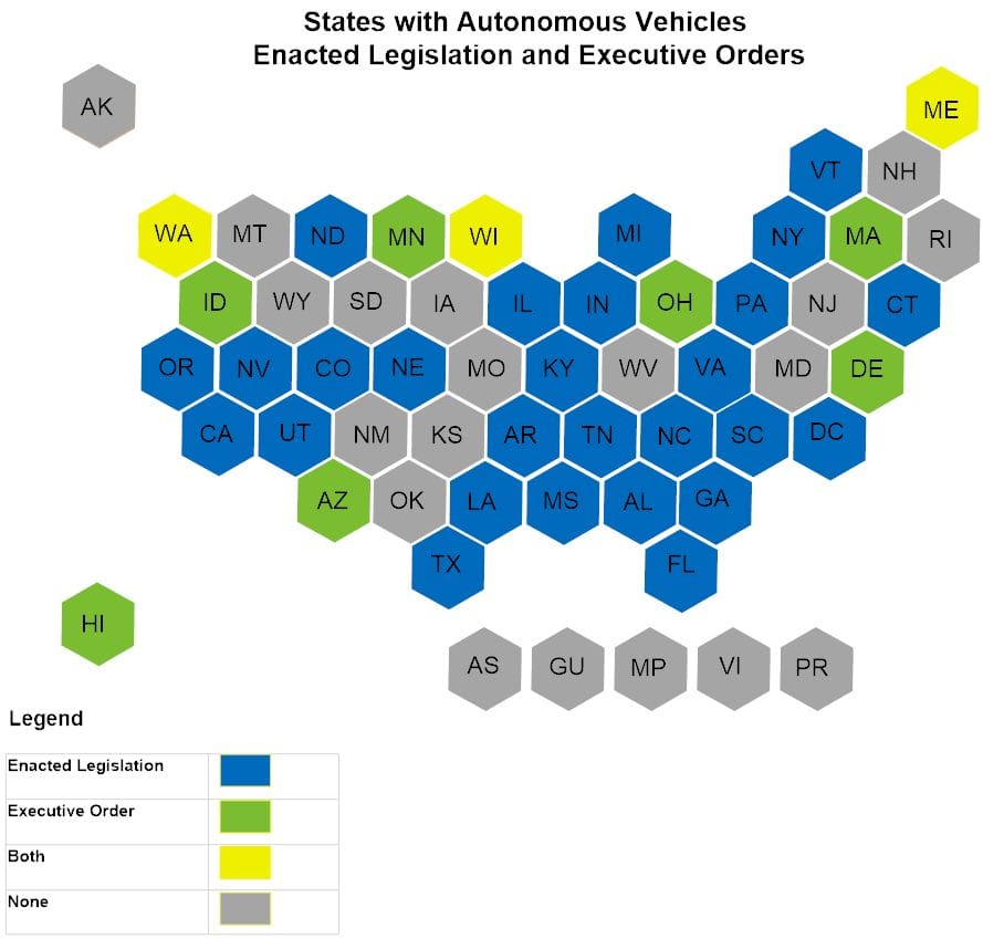 Since then, 19 other states, including Alabama, Arkansas, Colorado, Connecticut, Georgia, Illinois, Indiana, Louisiana, Michigan, New York, North Carolina, North Dakota, Pennsylvania, South Carolina, Tennessee, Texas, Utah, Virginia, and Vermont– and Washington D.C. –have passed legislation to legalize or begin the process of legalizing the operation of autonomous vehicles on public roadways.