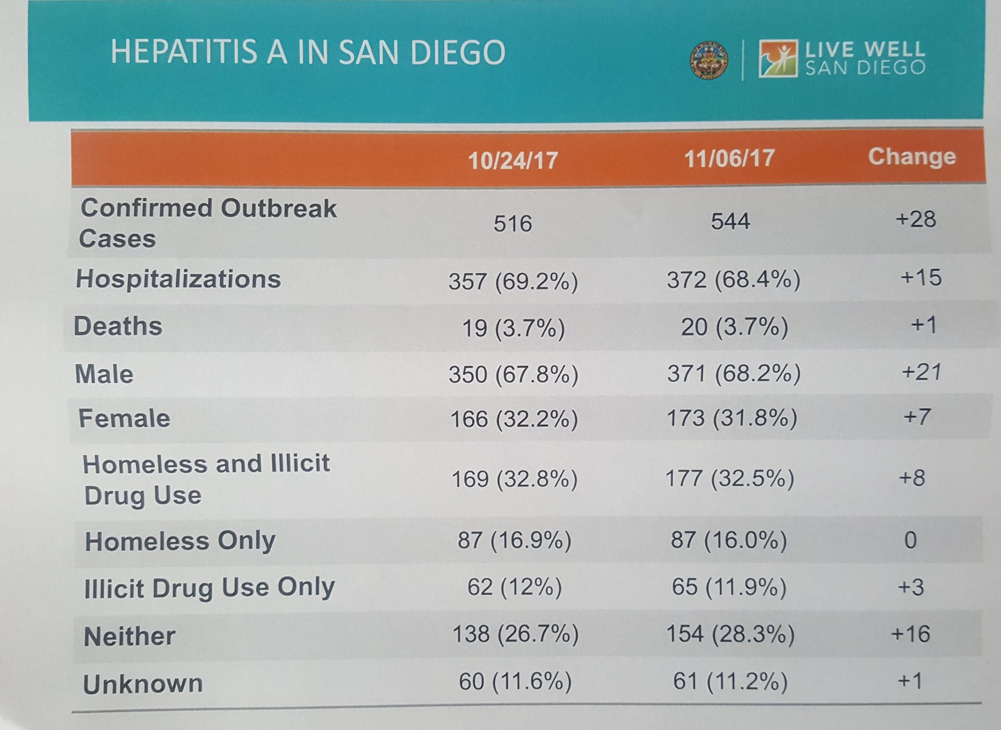 That line indicates that the number of Hepatitis A cases in San Diego grew by 28 from the weeks 10/24/17 to 11/06/17. But after being quizzed by the Supervisors, it became clear that wasn't the case at all.