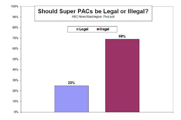 Almost 70% of Americans would ban Super PACs if given the chance, according to an ABC/Washington Post Poll. Several reasons for opposing “independent expenditure only committees” include the extremely deep pockets and glaring lack of oversight allotted to Super PACs. Organizations like American Crossroads, Restore our Future, and Priorities USA Action are not only tax-exempt and not required to immediately identify donors, but are able to spend money however they choose, so long as it does not coordinate with a specific candidate or party.