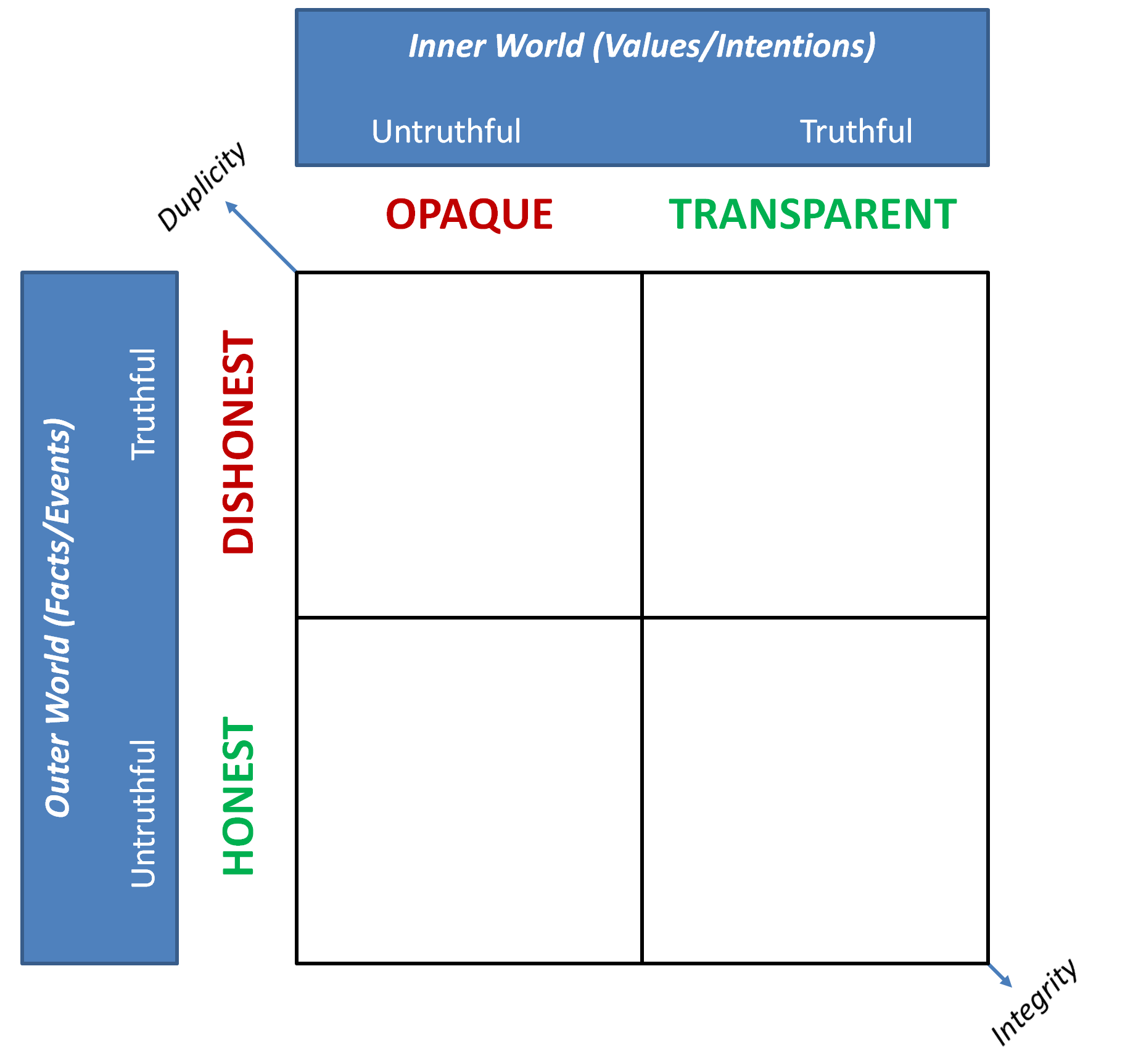 There may be a better choice of vocabulary, but to capture the necessary distinction, I’m going to call those who are truthful about their inner world (in both their direct statements and the consistency of the impressions they give of themselves) “transparent” and those who are not “opaque”. I’m going to call those who are truthful about the outer word “honest” and those who are not “dishonest”.