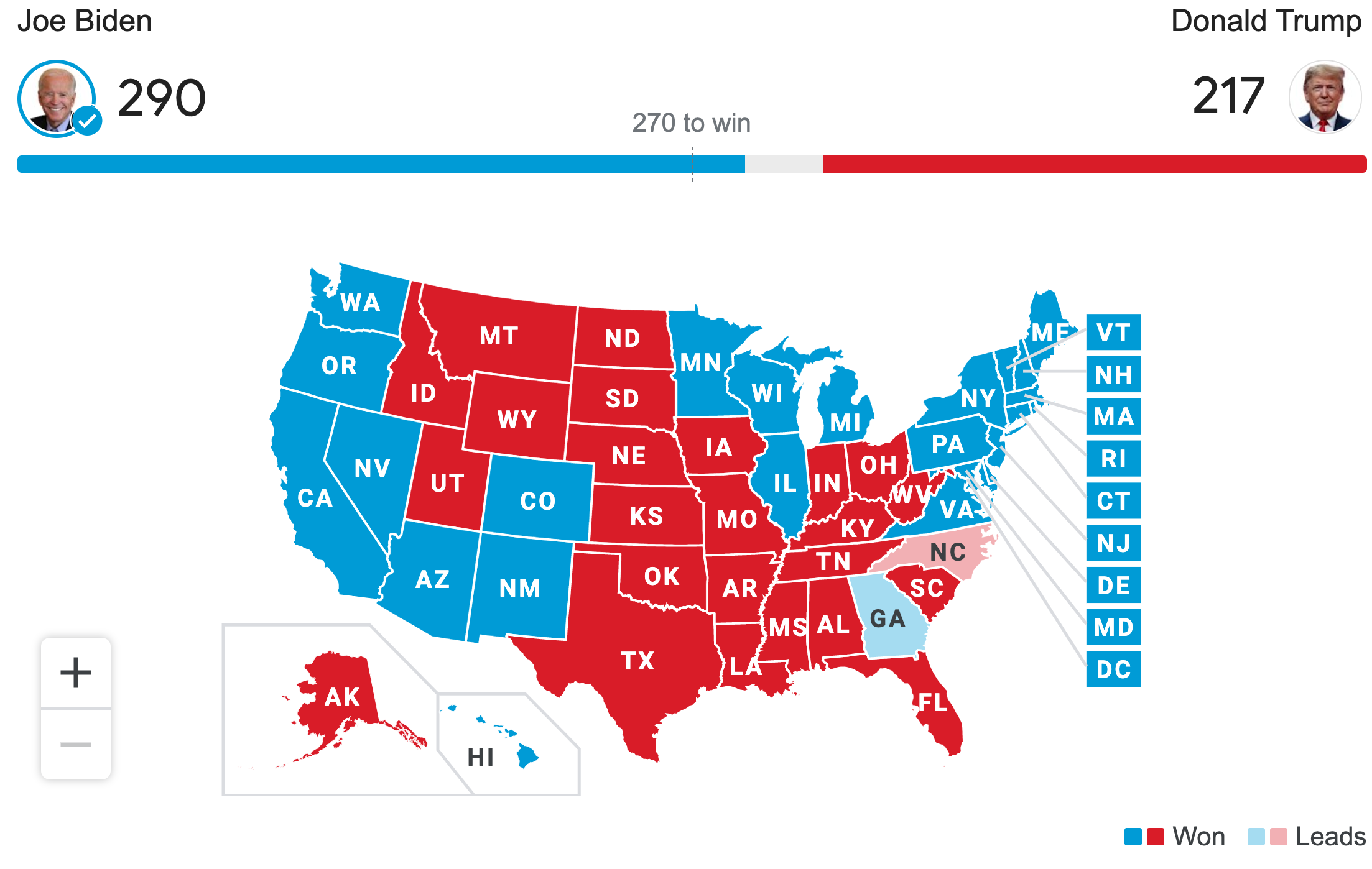 As the results currently stand, Joe Biden has 290 electoral votes, and Donald Trump has 217. To win, Donald Trump would have to flip states worth 37 electoral votes in total from blue to red to best Biden by 1 vote. The Trump campaign has focused its litigation efforts on Michigan (16), Pennsylvania (20), and Georgia (16), as well as Nevada (6) and Arizona (11).