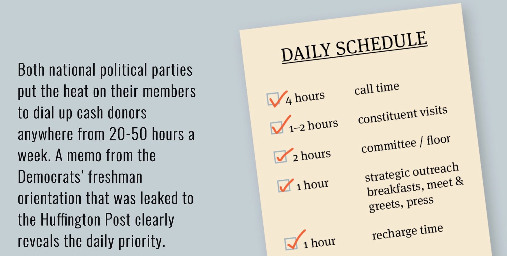 On Capitol Hill and in campaigns across the country, a river of money flows through every hour of every day. Candidates and members of Congress spend up to 50 hours a week with phones glued to their ears. They are telemarketers, begging for big dollars from those who can afford it.