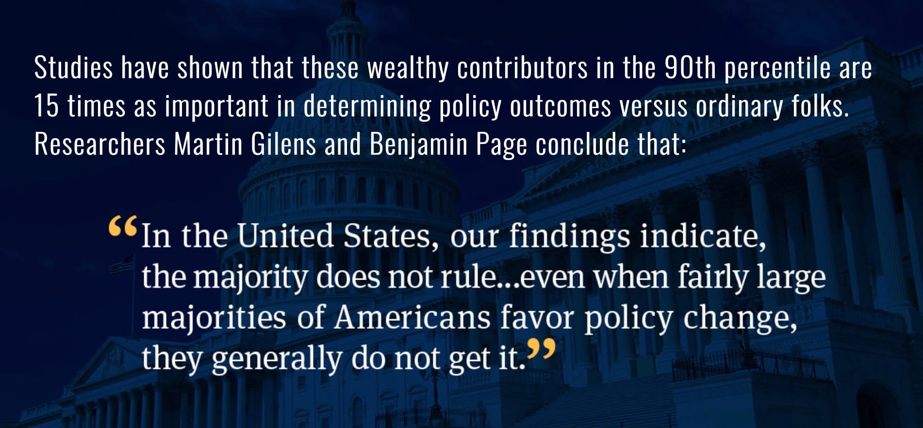 But we don’t need to rely on qualitative descriptions to know how money rigs the game. In a 2014 research study, Martin Gilens and Benjamin Page analyzed 1,779 policy decisions over 20 years. They discovered that the preferences of “economic elites” — defined as Americans in the 90th income percentile — were 15 times as important in determining policy outcomes as ordinary folks.