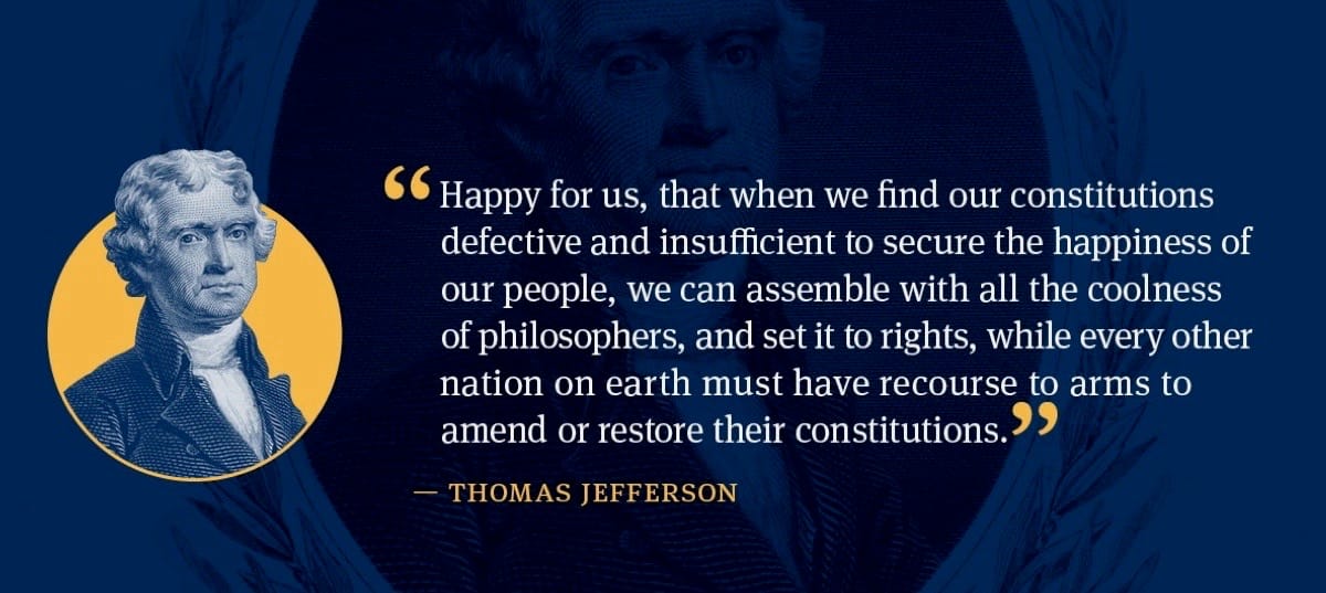 The assertion itself sounds ironic to a super-nerd like me. Of course, I’m the first one to agree that we need to reform the rules — and that may include the amendment process. But at the same time, the very Constitution that the poll respondents were criticizing is the same one that actually allows for the answer. Thomas Jefferson expressed this well in his letter to letter to C.F.W. Dumas in 1787.