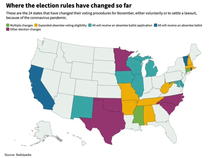 With fewer than a hundred days to the presidential election, almost half the states have now altered some normal laws or regulations to make casting a ballot easier and safer in light of the coronavirus.