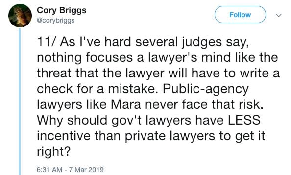 Briggs also raised the point that in these cases, public sector lawyers like City Attorney Mara Elliott, are immune from malpractice judgments: