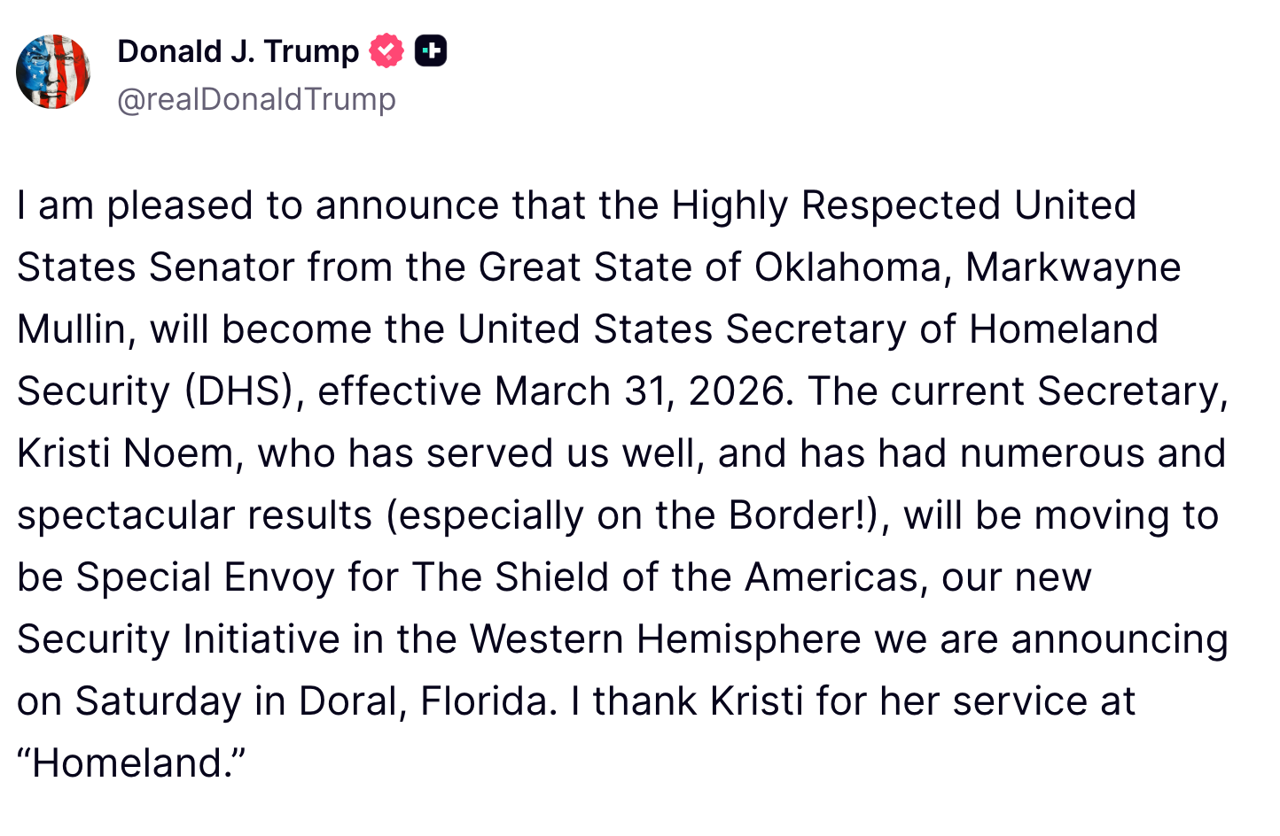 WASHINGTON, D.C. - When threat levels are at their highest due to the situation in Iran, President Trump ousted Homeland Security Secretary Kristi Noem at 1:40 p.m. March 5 in a Truth Social post and named Republican U.S. Sen. Markwayne Mullin of Oklahoma as her replacement.