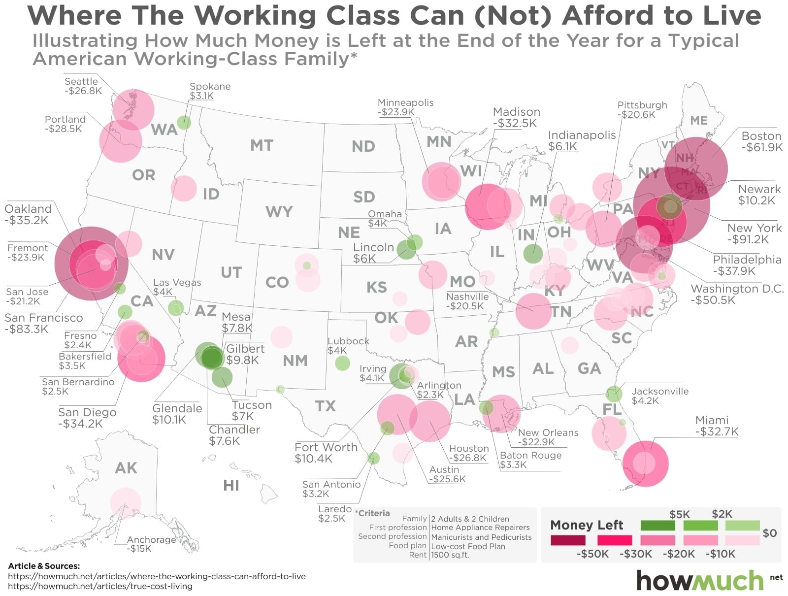 Recently, HowMuch.net put together a map (below) delineating the least and most affordable cities for the working class people in the U.S. This map can provide insight into where working class people need the most relief.