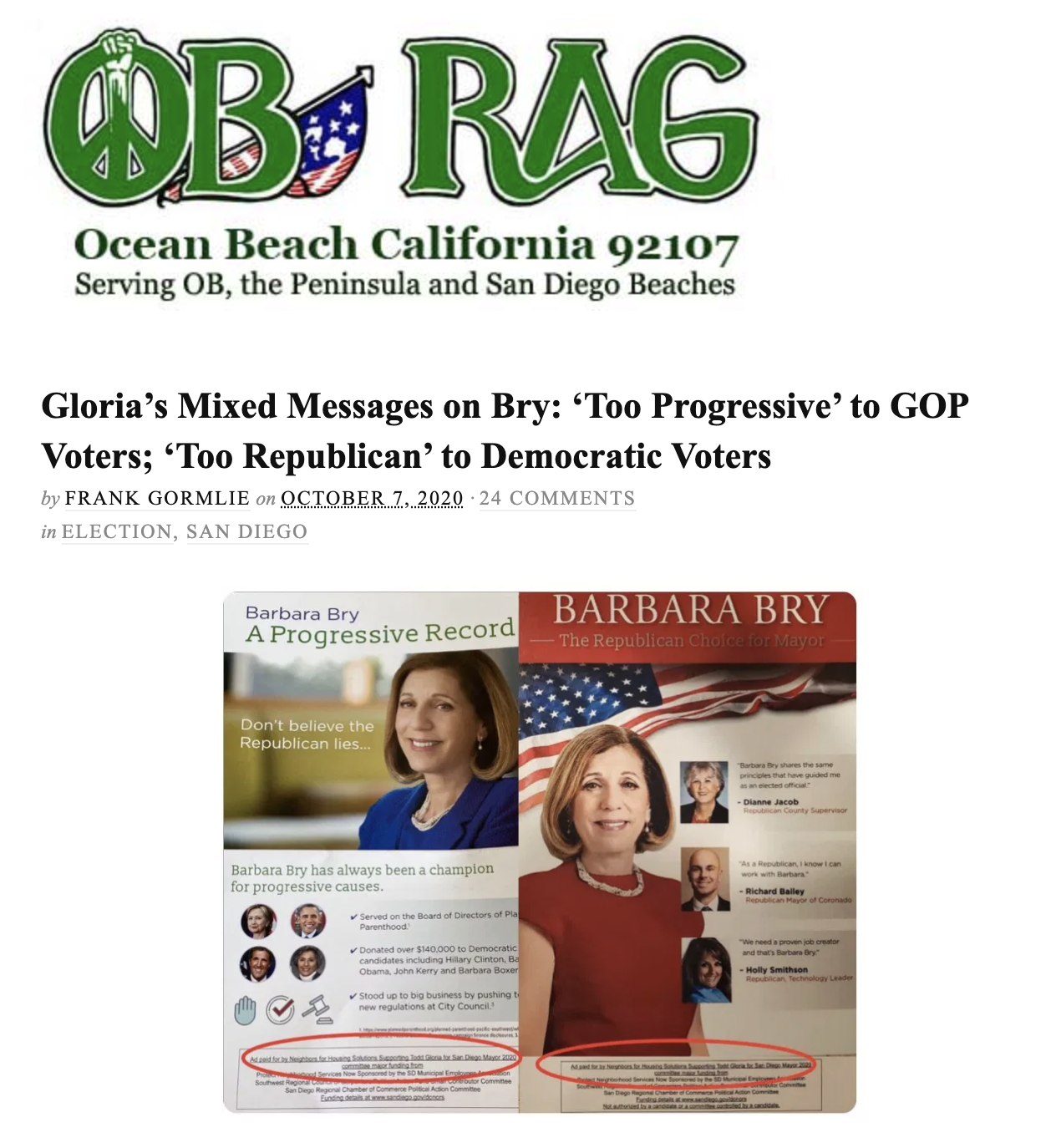 The OB Rag joined other media in covering the misleading ads sent by Todd Gloria's campaign telling Republicans that Barbara is a progressive, and telling Democrats she is a conservative. Both mailers are misleading in that they are made to look like they were sent from Barbara Bry. The OB Rag says: