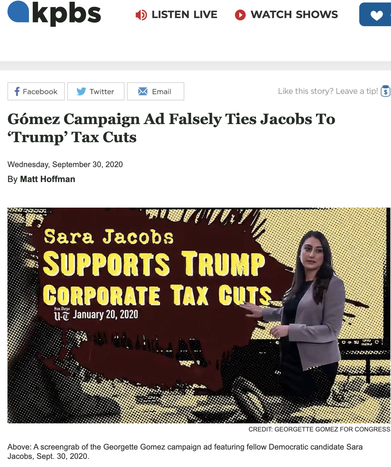 "The Gómez campaign cites a San Diego Union-Tribune Editorial Board interview from January 30 (not January 20 as depicted in the Gomez ad) where Jacobs allegedly made the comments. During that interview, Jacobs did tell the board she favored lowering corporate taxes, but she added that Trump's cuts were too much.
