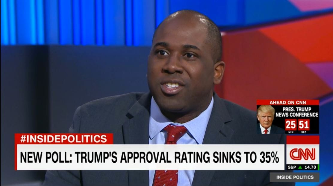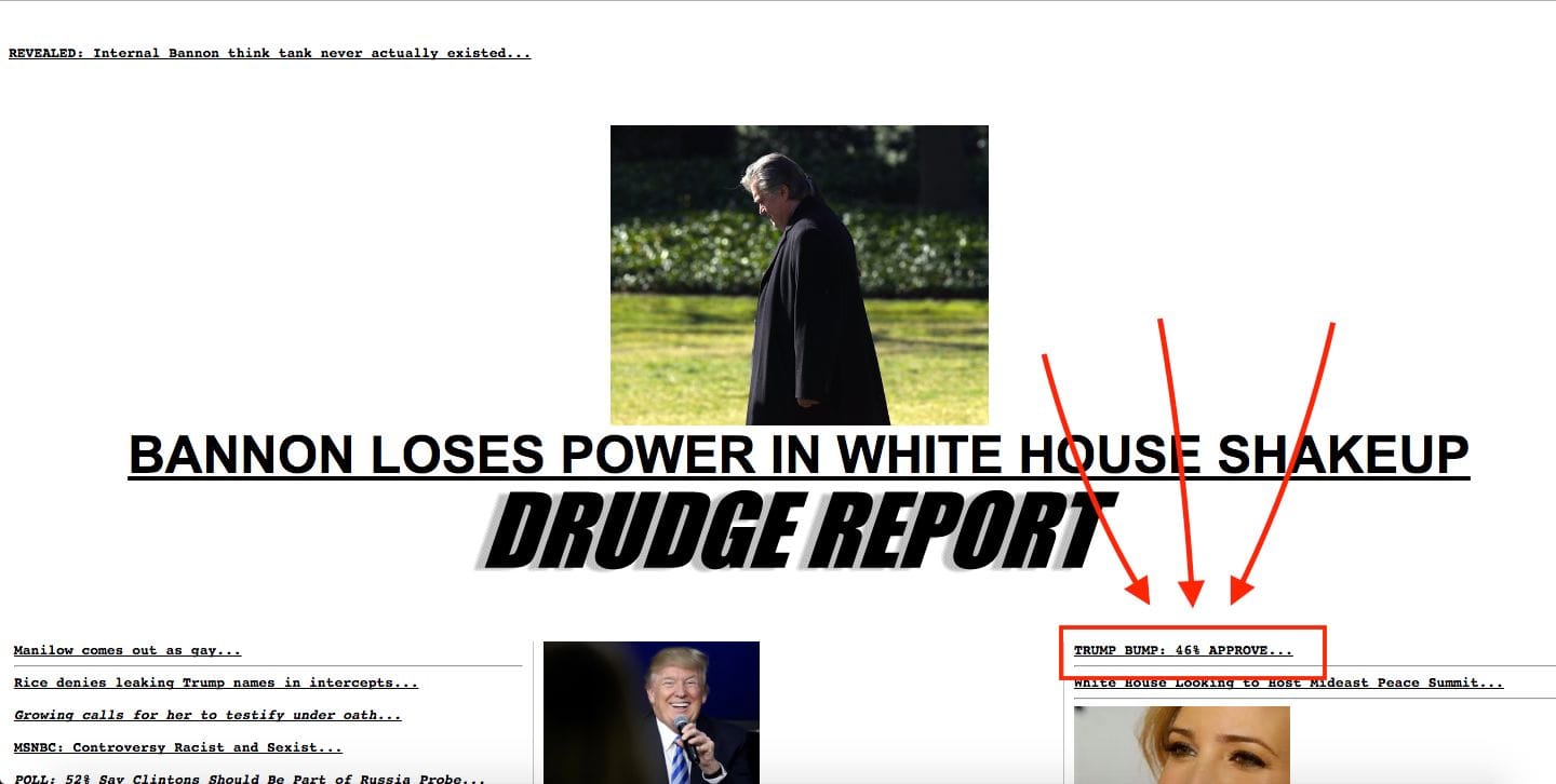 Take daily presidential approval polling. On Wednesday, there were two drastically different reports that came out. CNN, for example, reported that Donald Trump's polling had dropped to a new low of 35 percent. Yet at the same time, conservative-leaning news aggregator Drudge Report ran with the headline, "Trump Bump: 46% Approve." Screenshot of CNN broadcast, 4/5/17