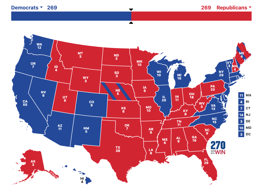 In the event of a projected tie in the Electoral College, one elector could change everything by switching their vote. In this scenario, the vote would then become 270-268, giving the majority to one campaign over the other. The lack of restrictions on electors in some states means that not all of them are bound to the popular vote in their state. Most experts say this is highly improbable, but there have been instances (though rare) in the past when an elector has changed their vote or gone against the popular vote in their state.