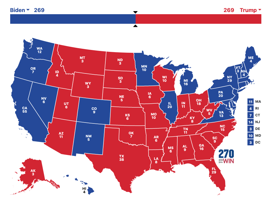But, what would happen if after all the votes are counted and electoral votes are allocated there is a 269-269 electoral tie? One might think if it could happen in any year, it would be 2020. However, one should not lose their head just yet.