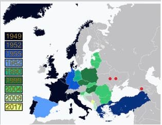 As a result, the North Atlantic Treaty Organization was formed shortly after the end of WWII. This treaty was originally meant to keep the Soviets from attempting to expand their influence past East Germany, but after the Soviet Union collapsed in 1991, a large power vacuum from East Germany to the western border of Russia was formed, and NATO began to fill that vacuum.
