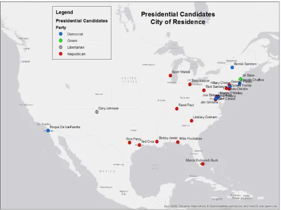 The above map of all 2016 presidential candidates locates their city of residence and shows the South and the Northeast are well represented with well-known candidates, but the West doesn't even have one with name recognition.