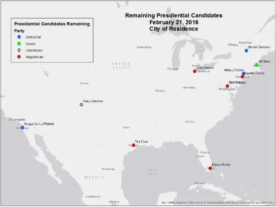 As of February 21, 2016, ten candidates remained, and the map above of those remaining shows even more clearly the representation of candidates with name recognition from the South and the Northeast.